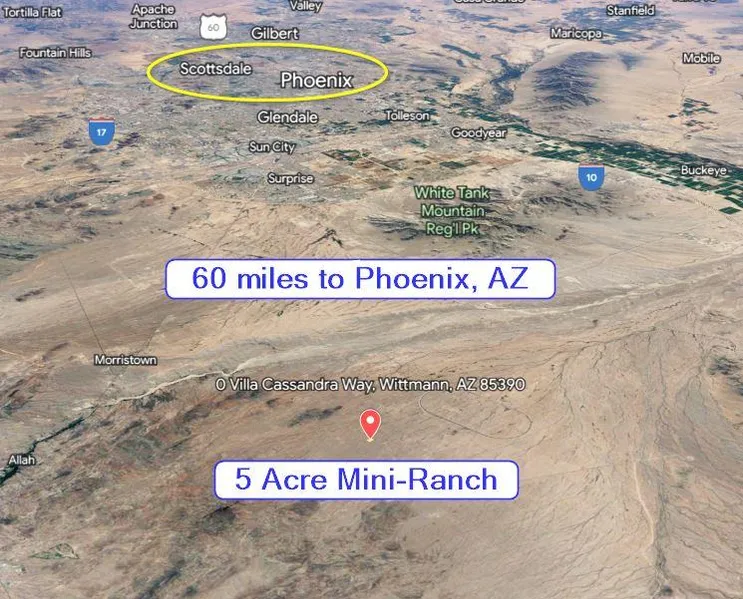 Here is an opportunity to purchase a clean-title huge ranch lot just 53 miles from downtown Phoenix with postcard desert and mountain views on 5 acres of usable land just 30 miles from Sun City and Surprise, AZ where the closest Walmart, medical, banking and full amenities are. The new Festival Foothills by Pulte Homes including the beautiful Copper Canyon golf course is 10 miles away, and the property is 15 miles north of Bill Gates proposed Belmont, Arizona smart city. The prestigious Whispering Ranch subdivision is country living at its best so close to the city, making this an ideal investment property or weekend country getaway!