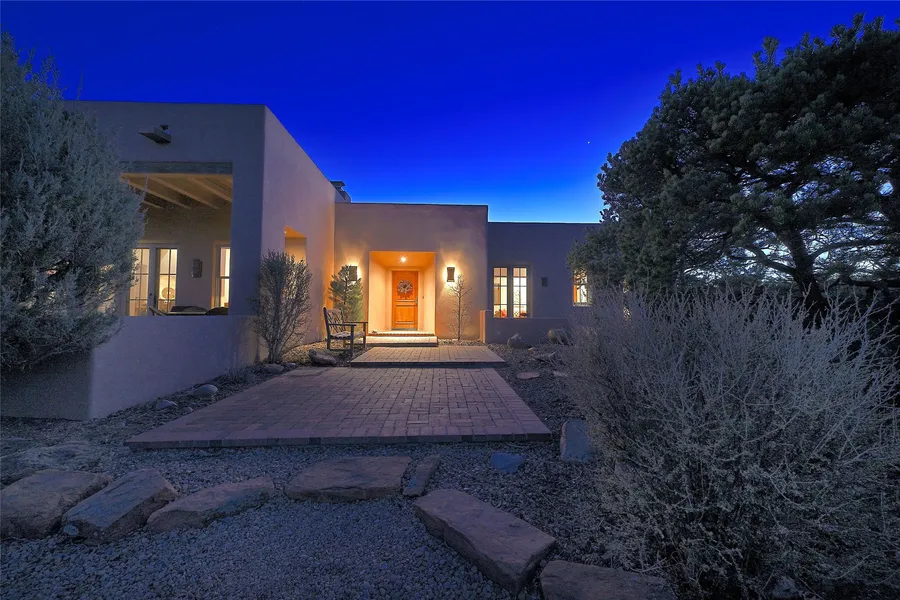 A sparkling private haven with Intimate portals and lovely walled gardens. This retreat is nestled in the trees with heart stopping sunrise and moonrise views over the majestic Sangre de Cristo Mountains. There are steps within this home, but the primary suite, library, great room and updated kitchen are all on a single level. The primary suite has an expansive with a newly remodeled bath and walk in closet. The library is adjacent, affording a completely private wing of the house. Two guest rooms and baths are elevated to take advantage of the mountain views. An expansive studio or craft room is not included in the square footage calculation and is big enough for all your creative endeavors. A mini-split for heat and cooling will make it a perfect year ‘round hideaway. The walled courtyard with waterwise landscaping and stately pinon trees offers tranquil outdoor surroundings for entert...