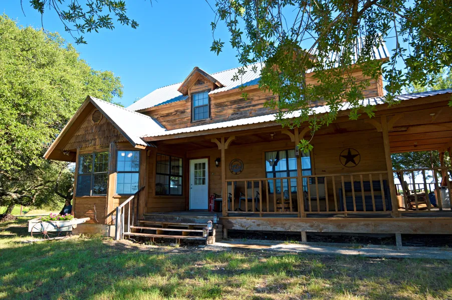 Beautiful oaks and such a beautiful country setting make this a special place to call home!! The owners have made wonderful renovations to this rustic home! It is beautiful and you will love it! Wonderful front porch providing great family time, porch swing sitting, wine sipping! You can kick your feet up here!! Home has beautiful woodwork!! Large living with wooden beams on ceiling, custom wood (real wood) floors in dining and kitchen! Great office for a work at home person or a wonderful apartment for extended family. Large oaks grace the yard and hill country views! Beautiful place to raise a family! Good small town school. Great place to retire, have a garden, bring the horses, raise a few calves or dorper sheep. Has a large storage building, a large metal shop, concrete floors, electric, water, 2 roll up door, 1 walk in door making it a great man cave or a party barn!! Property ...