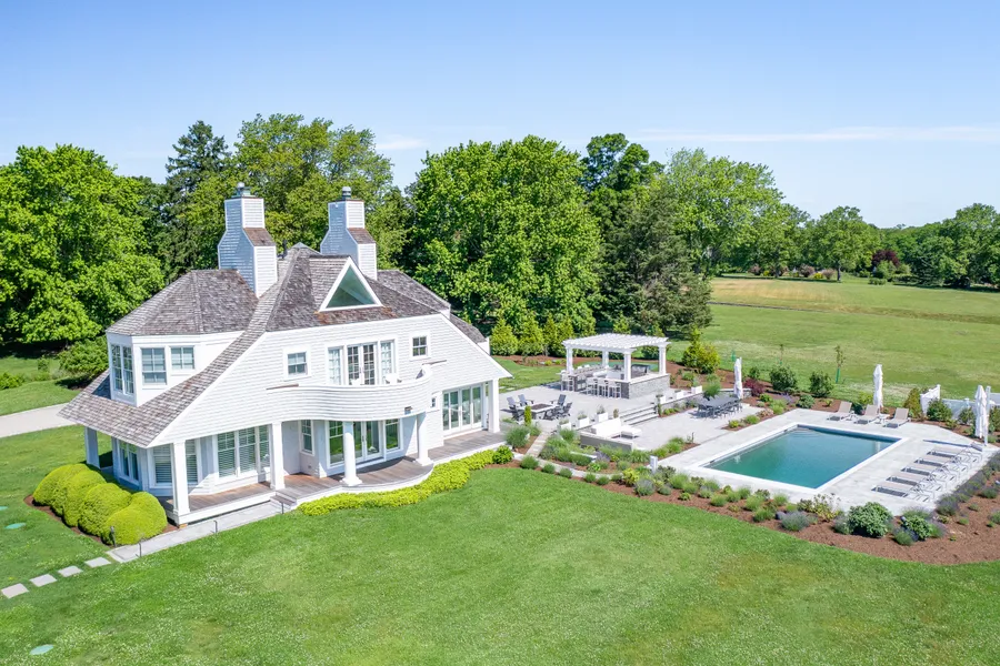 This stunning, 3.2 acre, seaside compound is set on a sprawling lawn that gently rolls down to its own dock, mooring, and private beach. Impeccably renovated down to the studs, every feature, finish, appliance and system are new. The first floor is fully open now, creating seamless flow through the dining and living spaces. Walls of windows and French doors invite light and water in everywhere. The gourmet kitchen has timeless custom cabinetry, Subzero, Wolf and Bosch appliances, a quartz waterfall island and countertops. The first floor also features a large ensuite bedroom addition. Upstairs, a breezy seating area opens to a balcony overlooking the pool, apple trees, bountiful lavender and the bay. The adjacent primary suite has cathedral ceilings, a gas fireplace and office area. Two additional ensuite bedrooms and new balcony complete this floor. The lower level is finished with a gym, media room, office/BR, spacious laundry room with double washers and dryers, Subzero and wine refrigerators, cedar closet and storage. Smart home features and A/V throughout as well as generator. Outdoor entertaining is elegant and effortless thanks to a picturesque, pergola-shaded outdoor kitchen with True stainless appliances, al fresco dining areas, gas fire-pit, putting green and fabulous pool. The property also features a poolside carriage house with two guest suites, outdoor shower and heated garage. Poppasquash Point offers privacy, open space, natural beauty and incredible wildlife.