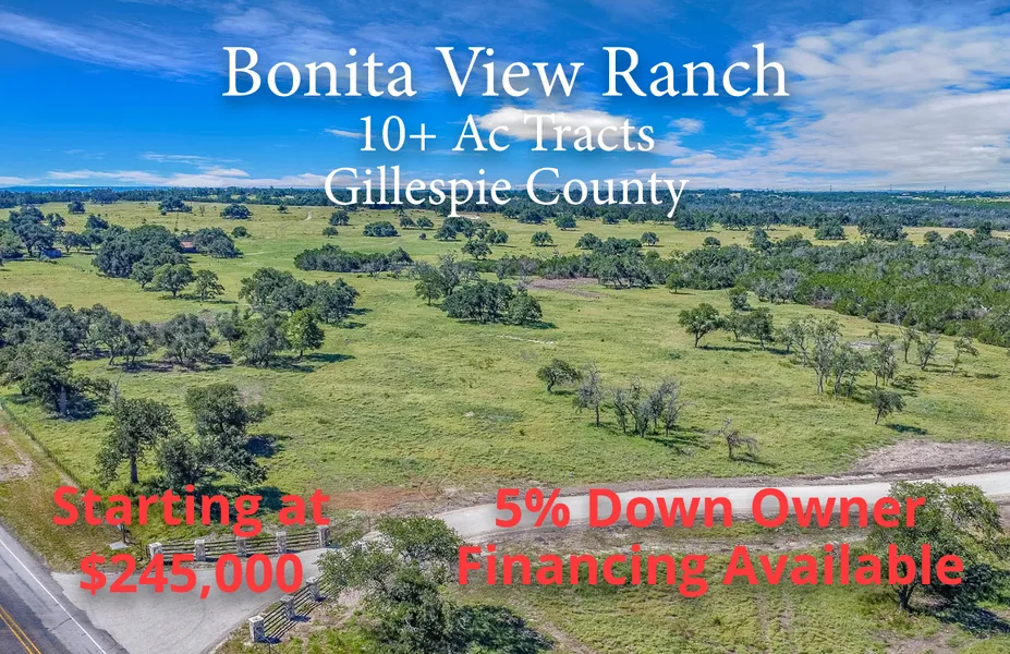 Bonita View Ranch is a new, small gated ranch community located just minutes north Kerrville. The 214 acre community offers 10+ acre tracts starting at $245,000. Owner financing is available with as little as 5% down. The rolling terrain varies from heavy cover to lush grassy areas dotted with large hardwoods. The land is horse and livestock friendly and holds native game. Each tract has nice building sites, ready for you to build your dream home. The gated entrance gives an additional layer of privacy to an already private setting. Bonita offers a peaceful and quite setting along with the conveniences of being close to all that Kerrville has to offer, and is only a hour from NW San Antonio. It's a wonderful place to get away from the noise of the city and enjoy a quieter lifestyle.