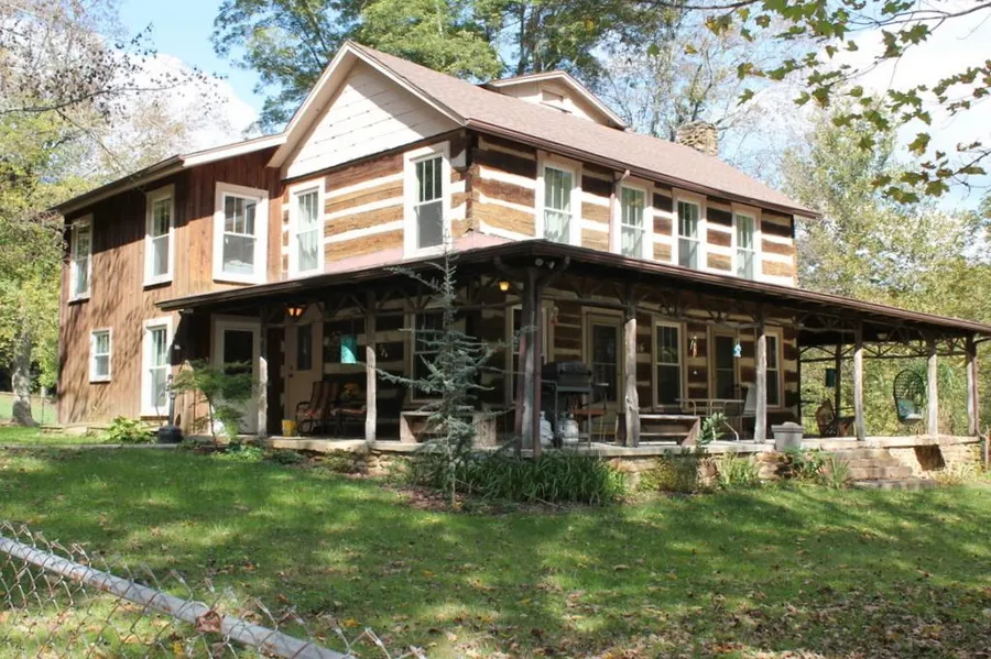 Built in 1860, legal description references property as "commonly known as The Log House Property". 2-story w/spacious rooms. Unique geode fireplace w/gas log in living rm. Master BR on main, lg dining room & kitc. Sitting area upstairs opens to 3 BR's. Covered porch wraps three sides. Chain link fence surrounds home. Big old barn & pond close by. Wooded hillside has rough road to peaceful lake (approx. 1 acre) and continues on to wide ridge top. Gorgeous. Could be purchased w/less acg (5-50).