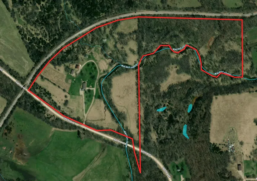 50 Acres m/l, 2 homes, 2 garages approx. half mile of Walnut Creek frontage. What a quiet beautiful setting in an amazing hunting area!!!