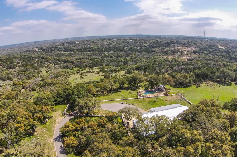 This pristine gated property is located near Wimberley, and looks out to beautiful Texas Hill Country. Sitting on 50 acres, it features a beautiful recently remodeled home, standalone workshop building, and hay barn. The property is the best of the Hill Country, with native plant life, pecan trees, and towering mature oak trees. The area around the home has been well manicured, with pool area and cabana. Stunning oaks compliment the shaded backyard.
