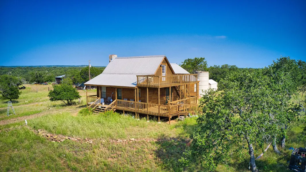 This property is a true hidden gem! The beautiful rolling hills provide fantastic views in all directions. Livestock grazing won't be a problem as there is abundant improved-grass pasture as well as native pasture. A few mesquites and lots of oaks provide ample cover for wildlife. The property boasts five ponds for watering all your animals and wildlife as well as three water wells. Working pens on the property. A 1300sf rustic-style two bedroom, two bathroom house is located hilltop and while providing gorgeous views, you can still enjoy your privacy as it is hidden from view from the state-maintained ranch road access. The house has a loft that opens to an outside deck allows you a 360-degree view if the view from the large, covered, southeast-facing front porch isn't enough.The front porch provides protection from the sun for enjoying the afternoons in the Hill Country. The 1400sf barn located just west of the house has a small (360sf) living space on one end. There is also a 400sf cabin on the property that with a little TLC could be used as guest house or additional residence. An additional barn is located by the cabin. Entire property can be accessed in a two-wheel drive pickup or SUV.