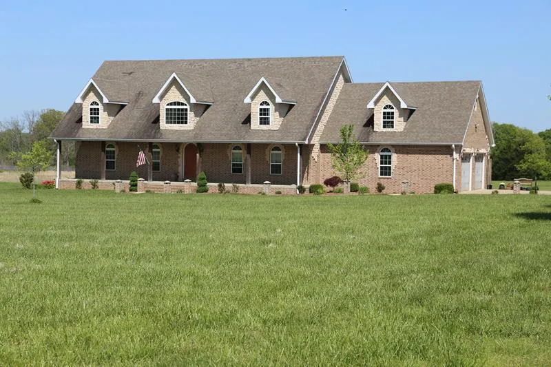 This homes exterior is brick and stone with a beautifully landscaped walkway to a covered entrance that stretches the length of the house. This home boasts hardwood and tile floors, vaulted ceilings, a stamped tin and tile ceiling in the custom built kitchen and formal dining area, a large kitchen island and an abundance of countertops and storage in the kitchens custom built oak cabinets. It offers 3 bedrooms one of which is the luxurious master suite with a setting room with view, walk in closets, a set up for a fireplace, a master bathroom with built in and lighted makeup area, and a jetted tub. This home also features a guest house or workshop close to the main home.