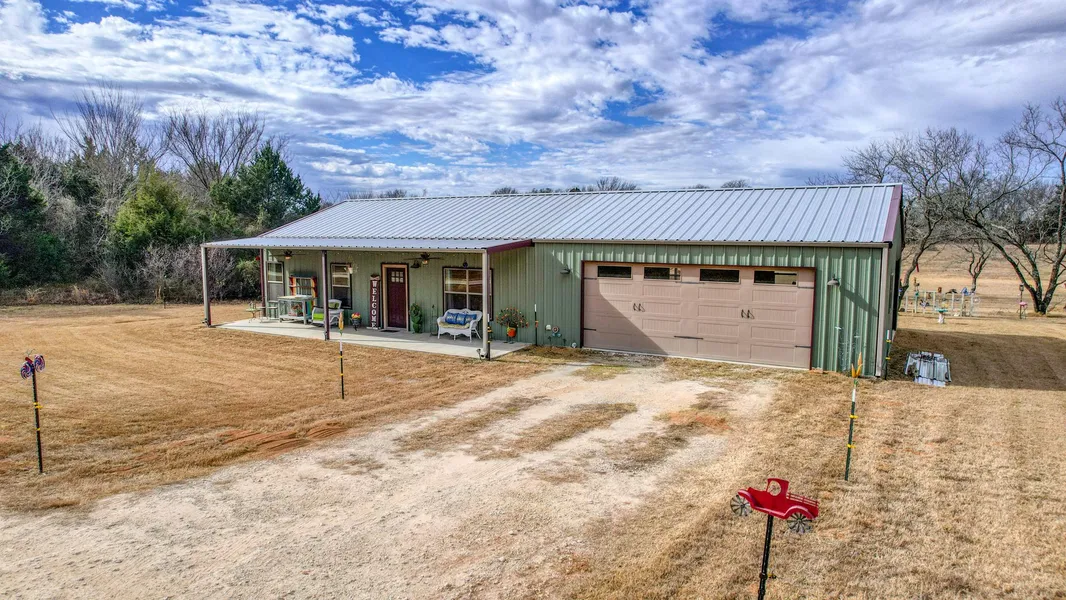 Dreams have come true! Beautiful barndo nestled on over 11 beautiful acres. Upon entry notice the inviting open concept of the living room area, kitchen and dining. Nicely stained concrete flooring through out the home. The kitchen is equipped with SS appliances and plenty of storage space in the beautifully stained notty alder cabinets. The bedrooms are spacious and complimented by the neutral color scheme throughout the home.900 sqft of garage space that could easily be converted into an additional bedroom. Two garage doors in front and one on side make for easy access. Enjoy the wildlife on your new over sized covered porches in front or back. Just minutes from HWY 67 & Interstate 35. Txt keyword RANCH6 to 88000 for more info.