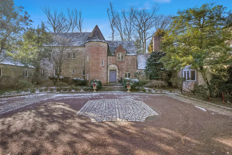 Rare opportunity in the private gated waterfront MEAD POINT Assoc. An enchanting 6 bedroom all-brick English Manor tucked away on 2.5 manicured acres with heated pool. Timeless 1936 architectural elements exuding charm and unspoiled character. Renovated and updated in 2001, this home is in lovely condition. The main level showcases a stunning living room with cathedral ceilings, hand hewn wood beams, massive limestone fireplace and multiple french doors opening to terraces and gardens. A wing off the living room continues to an antique paneled library with wet bar, as well as a spacious ensuite bedroom perfect for a first floor Primary. A banquet size dining room w/fireplace and french doors open to an outdoor veranda and courtyard. A well-outfitted kitchen with butlers pantry leads to another wing featuring a guest bedroom suite, office space, laundry and attached 3 car garage. Second level includes primary suite with vaulted ceiling, fireplace, and adjacent sitting room w/Juliet balcony. 3 additional bedrooms and 2 baths complete the second floor. Finished lower level features family room with fireplace and powder room.
