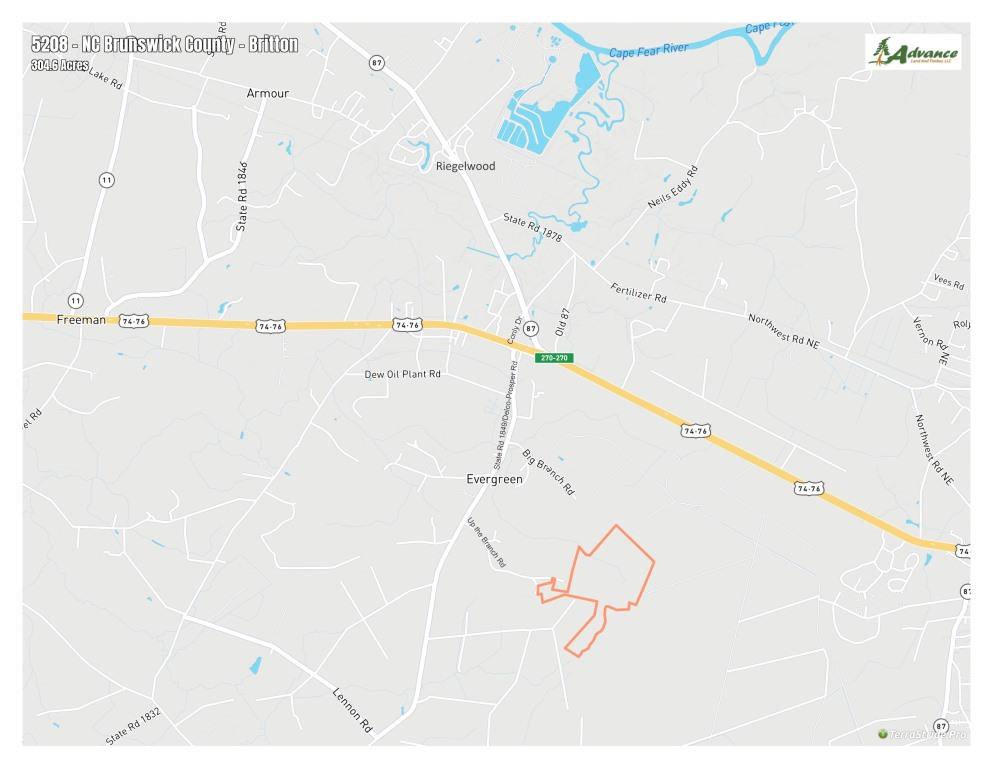 Research Parcel InformationFrom Riegelwood, NC, travel south on Hwy 87 and turn right onto Cronly Drive, which becomes State Road 189/Delco Prosper Rd. Continue for 1.7 miles and turn left onto Up the Branch Road. Gate is located approximately 1 mile on the right. Property is accessed through a deeded easement, and begins approximately 500 ft. from the gate.