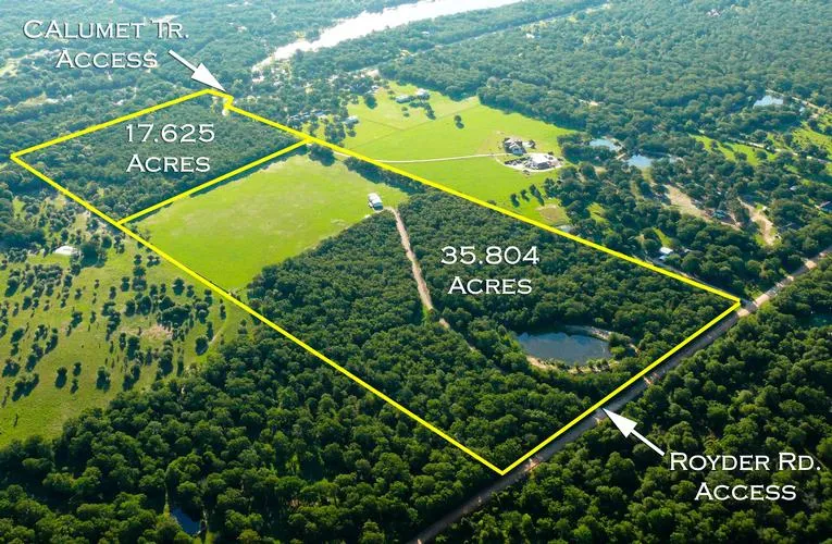 Approximately 53.429 Acres directly in the growth path of College Station! -Great ranch-homesite and/or Development Tract -Property is just South of the new Creek Meadows Subdivision and adjoins Woodlake Estates on the East. -Clean rectangular tract with gentle topography and no floodplain. -Great mix of woods and open pasture -Priced at $19,750 per acre. Seller will divide: -35.804 Acres fronting Royder Road ($24,500 per acre) -17.625 Acres fronting Calumet Trail ($24,500 per acre) Directions: -Greens Prairie Trail to Royder Road, South 1/3 mile to Main entrance on left. -Rock road leads through the woods past lovely pond ending at edge of a large open pasture and large manufactured home (4 bedroom with office) in great condition served by Wellborn Water and BTU Electric. -Cross the pasture to the NE corner of the tree line to enter the 17.625 acre tract. The tree line (fenced) is the W...