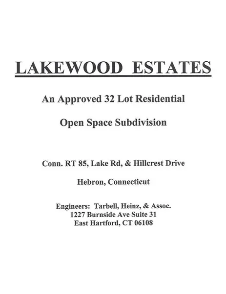 LAKEWOOD ESTATES is a Fully Approved 32 Lot OPEN SPACE Single Family Home Subdivision located in Hebron CT. An Environmentally Conscious Greenway Preservation Plan of Development Which Nestles 32 Single Family Home Sites Ranging from .7 Acres to 3.3 Acres Spread Across 53+ High and Dry Development Acres! This Primary Development Area is Surrounded by a Total of An Additional 71 Acres of Naturally Preserved and Dedicated Open Space Land Tract Areas! The Plan of Development Calls for Construction of Two Permanent Cul-de-sac Roads To Be Served By Under Ground Utilities, Public Sewers, and Individual Water Wells! Build Out of Lakewood Estates is Based on a Developer Friendly Multi-Phased Construction Plan of Development! Documents available include Complete Fully Approved Subdivision Plan, Full Road and Utility Engineering, Conditions of Approval, Delineated Recorded Open Space and Wetland A...