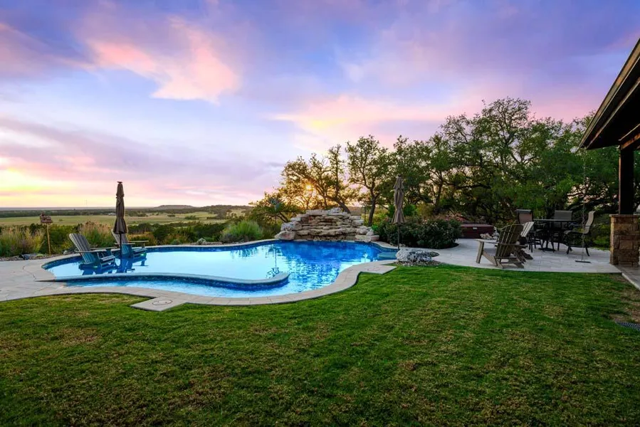 Panoramic Hill Country vistas from the home and the outdoor living area with ultimate privacy on all sides in a small, exclusive, gated, 4-lot large acreage community. 40+ mile view at 1040 ft elevation. City lights of Marble Falls, Burnet, and Buchanan Dam are visible on a clear night.