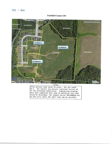 54 Acres of vacant land. Parcels 0534009210, 8.06 acres, and parcel 0534009211,3.67 acres, represents Section 2 of the Brentwood Subdivision. there are 39 lots in Section 2. In 2003 engineering work was done to lay out he streets, sewer and water line improvements. This plan was approved by the City of Lancaster, but it will need to be updated and approved again by the city since the plan was developed in 2003. the other parcel 0531008020,42.27 acres, has 101 potential lot sites. Section 1 of the subdivision.,43 lots, is nearly complete with several new houses completed in the last couple of years. The entire 54 acre site is zoned RS-3. There is potential for 140 single family home sites on the 54 acres. City utilities adjacent to this site.