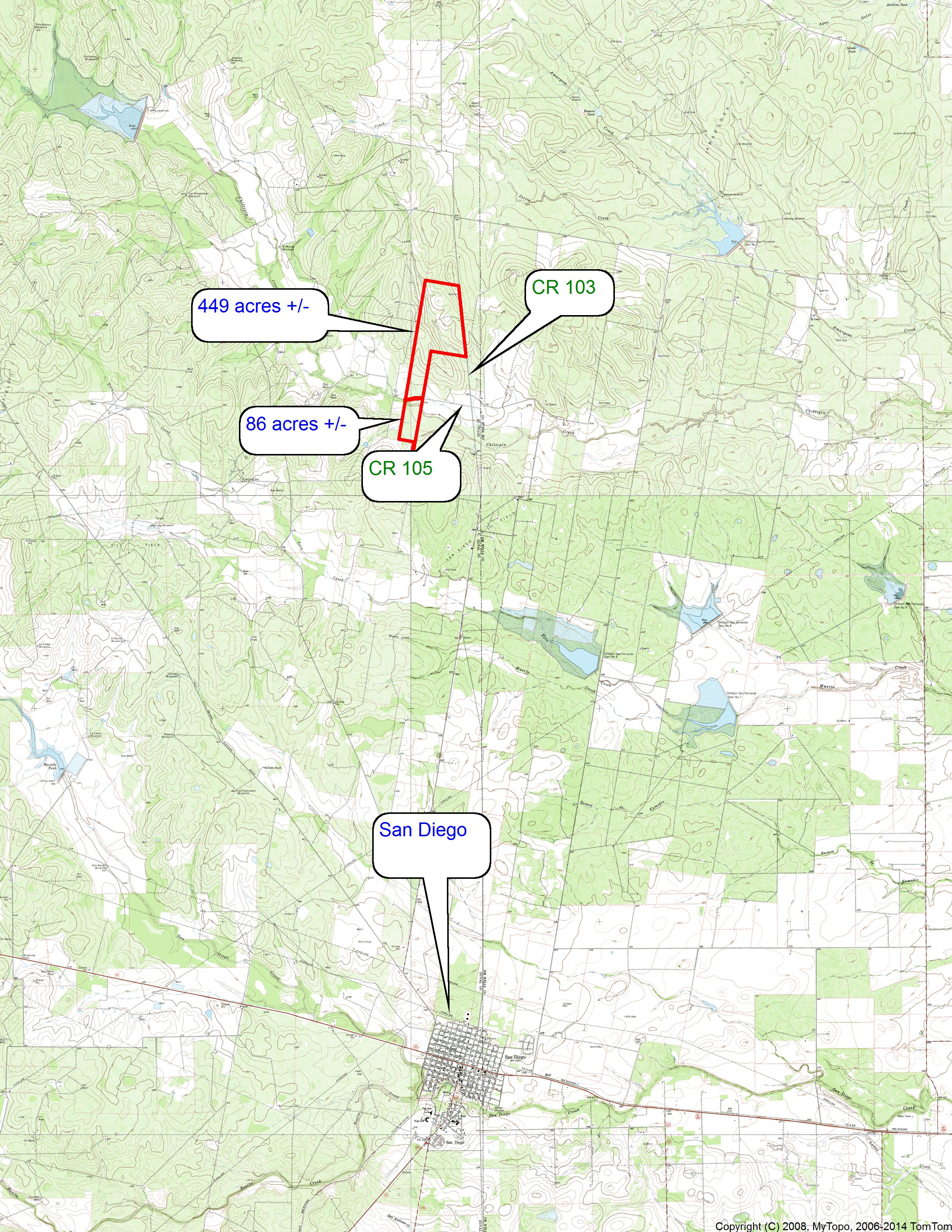 Location: The property is located about 7 miles North of San Diego on CR 103. The ranch has about a mile of frontage on the West side of CR 103 and frontage on CR 105 on the South part of the ranch.