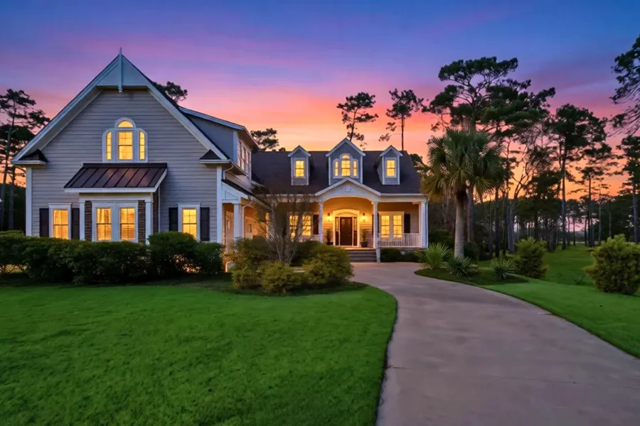 Overlooking a portion of the award-winning Tiger's Eye Golf Course, this exceptional low country residence offers refined craftsmanship, sophisticated comfort, and breathtaking panoramic view of tee-to-hole vistas and a serene pond setting. The covered porch welcomes you in true low country tradition, while the expansive stone patio in back—complete with gas firepit—is surrounded by illuminated mature landscaping and palm trees.