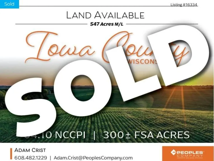 Peoples Company is honored to introduce this exceptional opportunity to own 547.86 acres of highly sought-after Iowa County land. Youll find this masterpiece in the heart of Iowa County just 30 minutes west of Madison, Wisconsin. This property is a complete package with an abundance of opportunities for hunting, fishing, and boasting almost 300 acres of tillable acres.