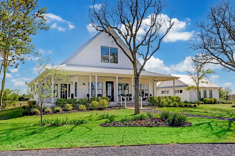 Trinity Farm, minutes from Round Top, sits atop 55.369 acres with a panoramic view, 2 stocked ponds and enjoys a coveted wildlife exemption. The newly constructed main house has 3 bdrms, 2.5 baths, a wraparound porch (1178 sq ft), a see-through fireplace, oversized kitchen island with a cooktop, wood floors and tons of designer upgrades. Outside, there are 2 vintage, fully restored guest houses. One is 4 bd/1.5 bath and the other is a 3bd/2bath. These charming cottages (used for vacation rentals) are being sold fully furnished. There is also a newly constructed (2020) 40 X 60 fully insulated shop with 3 roll up doors, 5 cement slab, high end lighting and an upstairs office. Other amenities include a newly surfaced tennis court, a gas firepit, a regulation Corn Hole course, another old barn and an antique house both waiting for your touch. This would make a great family compound or ...