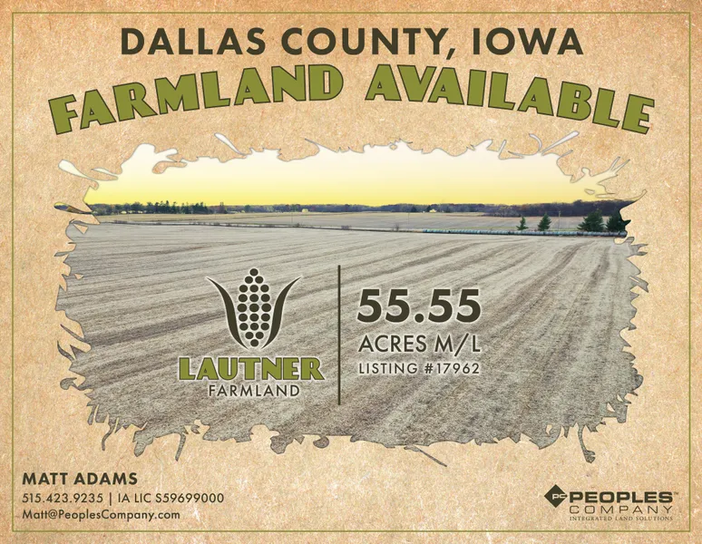Dallas County, Iowa Farmland Available Peoples Company is pleased to be offering 55.55 surveyed acres m/l of Dallas County, Iowa farmland located just outside of the ever-expanding Des Moines Metro. The farmland parcel is located north of Adel, Iowa and northwest of Dallas Center, Iowa with frontage along U.S. Highway 169; and in Section 29 of Sugar Grove Township.