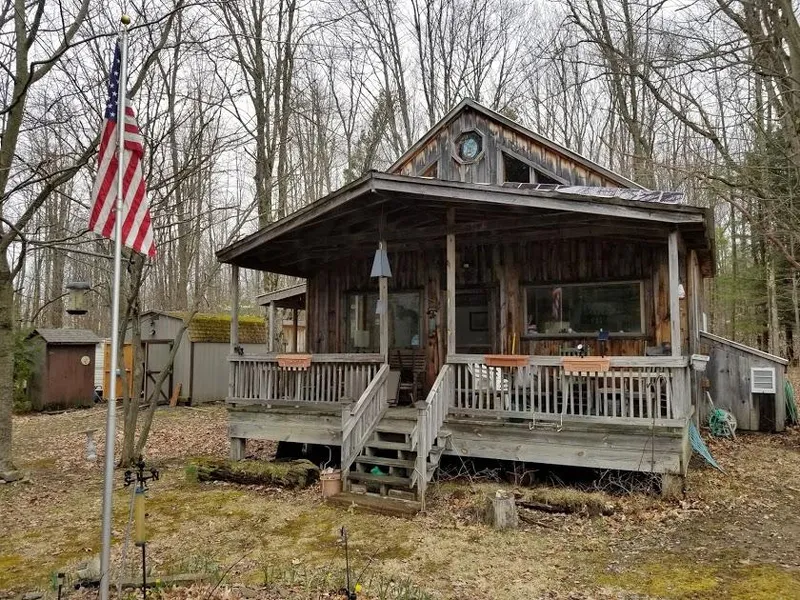The property has a well-outfitted 2 bedroom cabin with knotty pine finished vaulted ceilings and a loft. There is a spring-fed 1 acre man-made pond stocked with bass, perch and grass carp. The camp is located at the end of a seasonal road and the cabin sits back from the road at least 500 feet. The cabin has 9 solar panels and 4 bank battery to run the lights and the outlets with a backup generator. Well-bu...