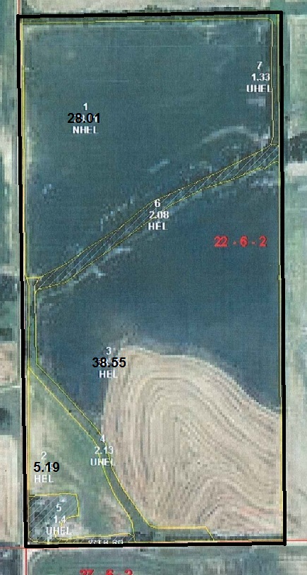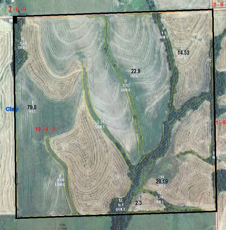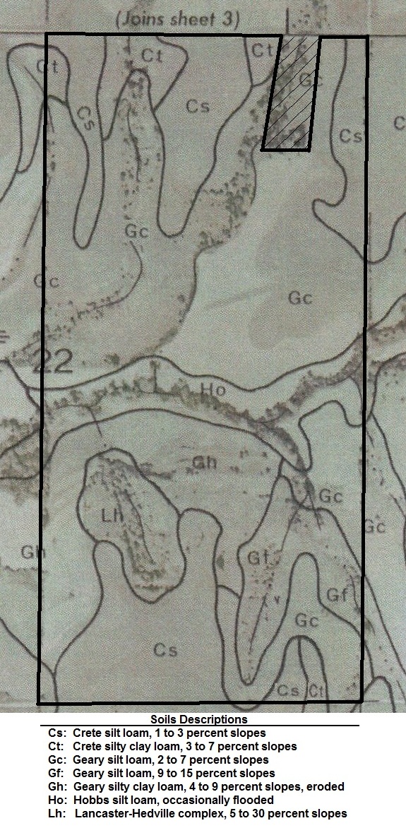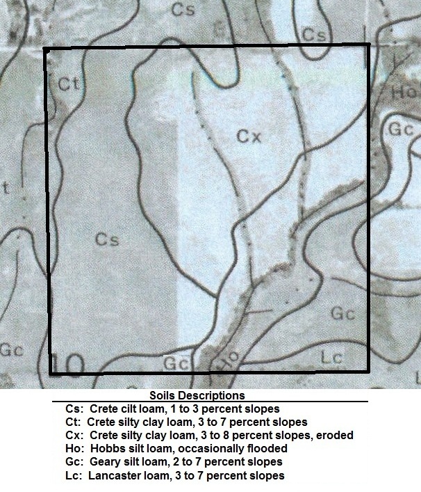 This farm, 160 acres, more or less, consists of approximately 19 acres bottomland cropland, 121 acres upland cropland, 9 acres waterways, and 7 acres creek and timber. The bottomland is all Hobbs soils and the upland is mostly Crete and Geary soils. Access to the field in the southeast corner is from the south, up Kiowa Road.