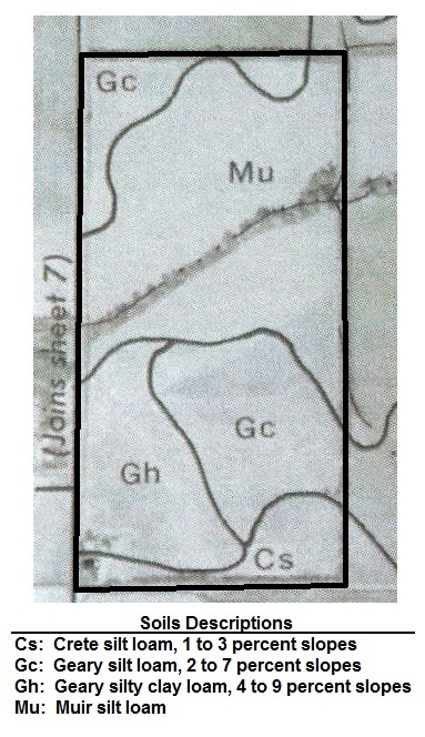 This farm, 80 acres, more or less, consists of approximately 33 acres bottomland cropland, 39 acres upland cropland, 2 acres waterways, 2 acres creek and timber, and 2 acres old farmstead area. The bottomland is all Muir soils and the upland is all Crete and Geary soils. There is rural water at the farmstead.