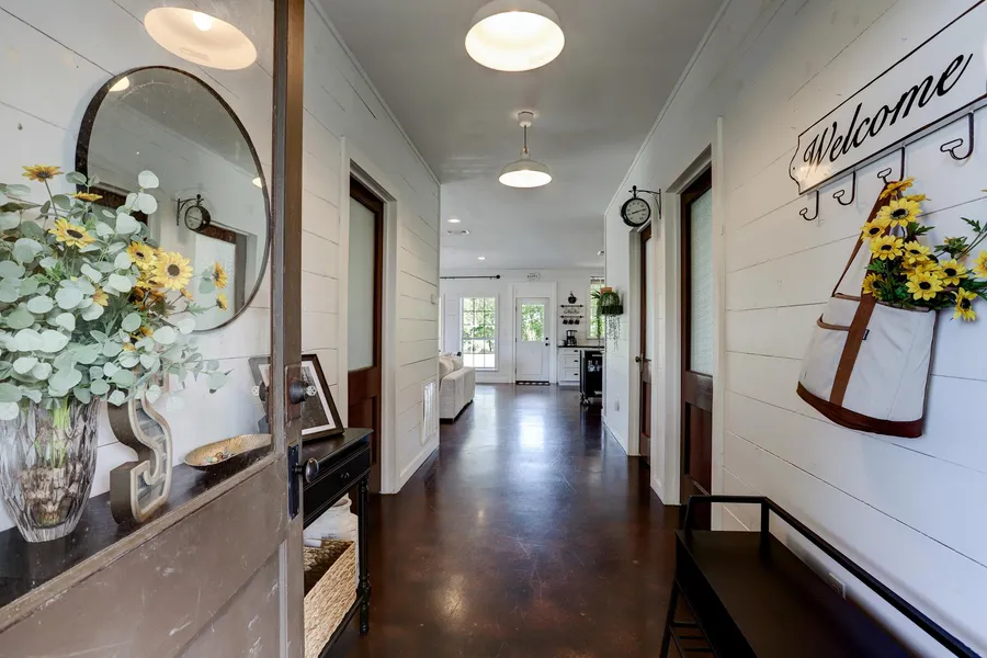 Located in the rolling hills, 5 minutes from the quiet town of LaGrange, you will find an almost four acre, 3/2 home. Large windows bring in natural light, while the shiplap walls, antique doors, unique lighting fixtures create a cozy country setting. Two covered 40' decks allow for you to enjoy the outdoors, wildlife & stars at night. A concrete oversized driveway (2023) is conveniently located by the front deck for you & guests. The primary bedroom has an ensuite bath (2023) with large walk-in shower, double sinks & large walk-in closet. The other two guest rooms have easy access to a new bathroom with tub/shower combo. The main gathering room flows into dining/kitchen area allowing for easy conversations. There is a large utility room with built-in pantry open shelving. Home is plumbed with an entire house water filtration system (2023). This property has a barn/workshop/RV area and private office. Access from a paved road for horse trailers, Boats, ATV's, Motorhomes or FFA projects.