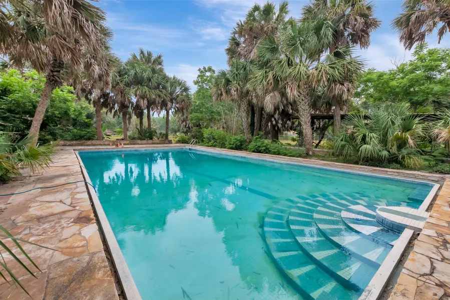 Welcome to your private oasis! This sprawling ranch-style home offers the epitome of luxury living on 40 acres of serene landscape. Boasting 4 bedrooms, 4 bathrooms, and 1 half bath across over 5600 square feet, this estate offers ample space for comfortable living and entertaining. Step inside to discover a top-of-the-line kitchen, perfect for the culinary enthusiast and entertaining guest. On the opposite side of the home from the kitchen you will find the library, ideal for unwinding with a good book. Outside, a covered patio beckons you to relax and enjoy the tranquil surroundings. Follow the path to the oversized swimming pool, surrounded by towering palms and lush foliage. His and her cabana restrooms ensure convenience and comfort for you and your guests. For the hobbyist or craftsman, concrete covered outbuildings provide ample space for workshops, while a huge metal pole barn offers storage for all your outdoor equipment needs. Nature enthusiasts will delight in the property's features. For the cattle rancher or someone involved in activities related to horses or equestrian pursuits you have 12 stalls that need a little TLC and stock pens which provide access to an arena. Whether you seek a peaceful retreat or a place to entertain on a grand scale, this exceptional property offers the ultimate in luxury living.