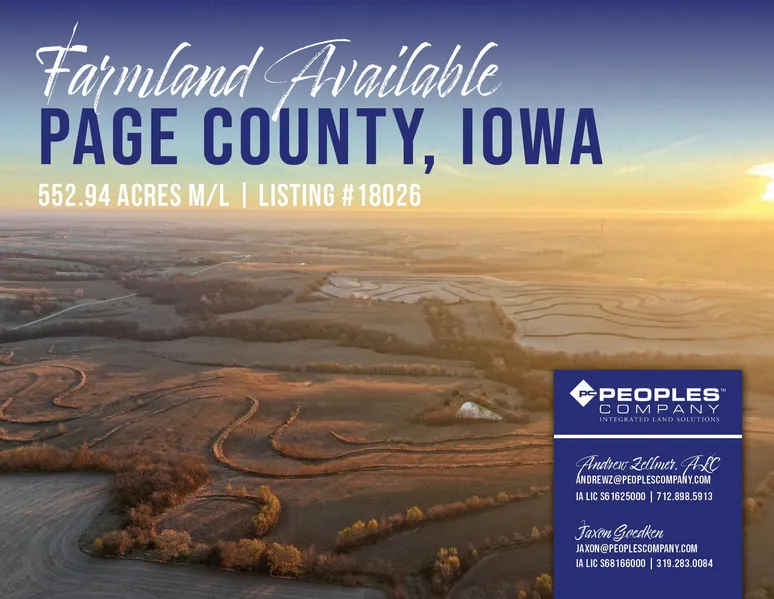 Peoples Company is pleased to present this expansive 552.94 m/l acre Page County, Iowa property, located just east of College Springs, Iowa. This unique farm offers a blend of highly productive farmland and exceptional recreational opportunities. With 455.90 FSA cropland acres at an average CSR2 soil rating of 58.7, this farm provides a fantastic opportunity for agricultural production, supported by highly productive Colo-Judson Silty Clay Loam, Sharpsburg Silty Clay Loam, and Adair Clay Loam soils. The property has easy access via County Road J56 and P Avenue.