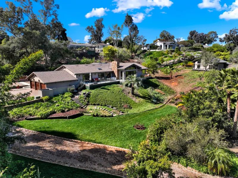 This beautiful home was originally designed by Clinton Marr who attended USC school of Architecture under the esteemed tutelage of Archibald Quincy Jones FAIA, a Los Angeles based architect and educator. This design is in the modernist style and rests on a quiet cul-de-sac that leads into the horse trails and is not far from The Village of Rancho Santa Fe and Rancho Santa Fe's Golf Club. This home was originally built in 1973 and beautifully reimagined in 2015 with an open concept and an abundance of natural lighting. This smart house is powered by a Whole House Solar System that meets 2022 Net Energy Metering 2.0 qualification and is seller owned. There is a 60X12 FT salt water eco friendly exercise lap pool and spa conveniently located close to the house. There is an ease of approach to a level 3 side by side finished car garage with an epoxy floor, storage and two electric charging stations. Access to the house is through a remote operated gate and the lot is fully fenced. A nice length of driveway to the home extends to a large parking pad to accommodate many cars for entertaining. In addition there is a dry and air filtered finished basement including base boards. The basement uses are perfect for a home gym, home theater, wine room, game room and currently offers excellent storage. For over night visitors there is an approx. 945 SF guesthouse privately located within steps from the main house. Both the main house and guest house are in a serene setting and independent of each other. Both are serviced by the Whole House Solar System. The total sense energy freedom