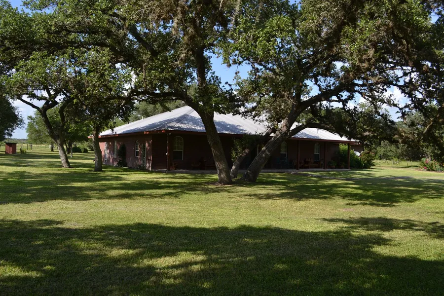 HOME & LAND - Whether for weekends/holidays or full-time purposes this custom built all brick ranch style home with park like landscaping immediately surrounding home and barn area, as well as 60+/- ACRES of recreational and livestock grassland with beautiful LIVE OAK TREES. The home offers a huge covered front porch, a quaint back porch, over sized two car garage, metal roof, large open kitchen that includes bar top seating, MODERN STAINLESS APPLIANCES, GRANITE COUNTER TOPS, dishwasher and fridge, vaulted ceilings and fireplace in family room.