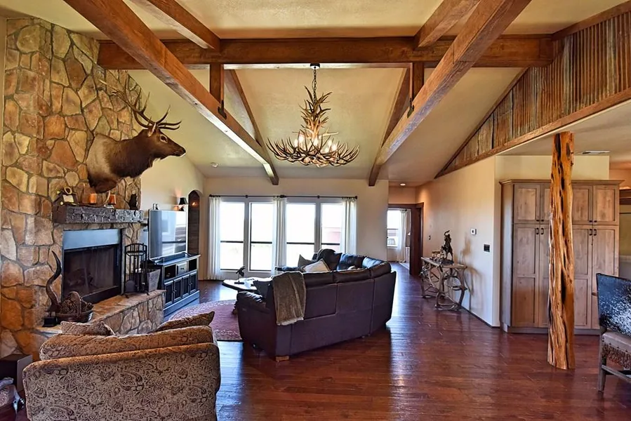 This beautiful, Hill Country style home, completed in 2018, features 2 bedrooms +office, 2 bathrooms, and over 2,000 square feet. Upon entry, you're immediately drawn to the vaulted ceilings with wood beams, large rock fireplace, antler chandelier, open floor plan and distant view. In the kitchen, you'll find top of the line appliances, a continuation of interior rock and wood, and custom cabinets throughout. The master bedroom takes in the northern view as well and features a very nice ensuite with a large walk-in shower and walk-in closet. Split from the master are the guest bedroom and office. Exquisite attention to detail is noted throughout this home-truly too many features to list. Detached workshop and carport. Strong Edwards well, wildlife exempt with an abundance of animals. Mixed topography with distant hilltop views and also some bottom land with two draws on property. High end feeders and blind to convey.
