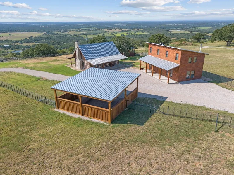 Nestled just 40 minutes from Fort Worth, this stunning 42-acre ag exempt property offers a truly rare and exceptional experience, combining breathtaking panoramic views with luxurious living and diverse natural beauty. This is a unique opportunity to own a piece of the Hill Country's magic, where the rolling topography and elevations reaching 1,120 feet create a majestic southern vista that is simply unmatched in this region. From the wrap-around covered porches of both homes, prepare to be mesmerized by a jaw-dropping panorama that stretches across at least four counties: Palo Pinto, Parker, Hood, and Erath. This isn't just a view; it's a constant, awe-inspiring spectacle that serves as the backdrop to your everyday life.