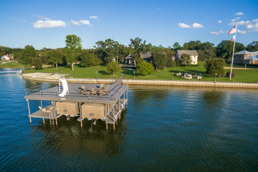 The oversized two car garage is adjacent to the house and accessed by a covered walkway. There is a large room, currently used as a bunk room, with full bathroom above the garage. The double boat house with touchless covers, storage and sink has a slide and party deck above.