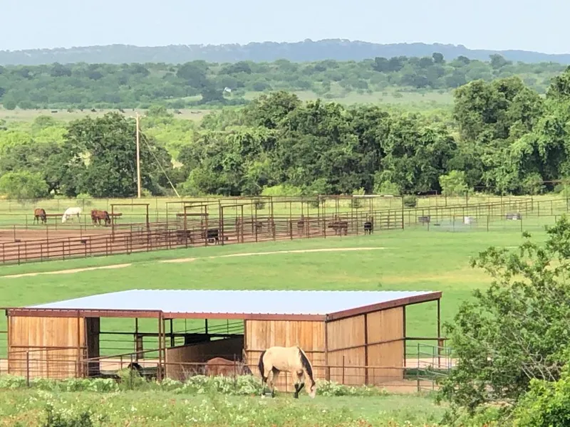 This 57 +/- acres is located in the heart of the Texas Hill Country with frontage on a paved Hwy 71 road and is ideal for livestock and horses. Improvements is include a newly constructed roping arena and large horse barn with stalls, tack room, feed room, and more. The arena has covered boxes, stripping chute, return alley, and a large catch pen at the back for cattle. The parking area that surrounds the arena has plenty of room for trucks and trailers. A nice coastal field and other grasses will provide plenty of grazing and opportunity for hay production. There is excellent fencing and cross fencing, 2 water wells with irrigation possibilities (one well is 100 gallons per minute), 3 sided hay/equipment barn, 3 turnouts with paddocks. Seller has added a 2000 sq ft slab with 1600 sq ft of living space.....it is designed to be a 2/2 home with living area, kitchen, and laundry room. ...