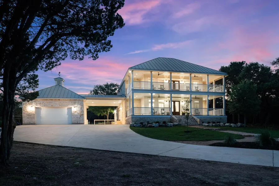 The first floor also hosts a secondary bedroom and a full bath. Upstairs, two additional bedrooms and two bathrooms with walk-in showers, a game room or secondary living space with access to the covered upstairs porch, as well as an additional washer and dryer hookup, enrich the layout.