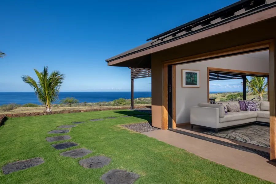 The house features polished concrete floors, stucco siding, a standing seam metal roof, vaulted ceilings, Cambria Quartz countertops, and custom bamboo cabinets and shelving. Huge Western pocket doors open to the most incredible ocean view, a large covered lanai, and a beautiful l...