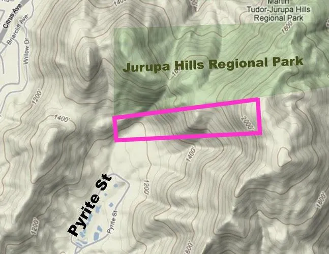 Driving Directions: FYI the address of Martin Tudor Jurupa Hills Regional Park is 11660 Sierra Avenue, Fontana and this parcel is adjacent to and south of the park. However, the parcel is not accessible by road. To get as close as possible to the parcel take Hwy 60. Exit at Pyrite St. Take Pyrite north to the end. Look northeast toward the parcel. Take an aerial map. Parcel is in San Bernardino County, adjacent to the border of Riverside County.