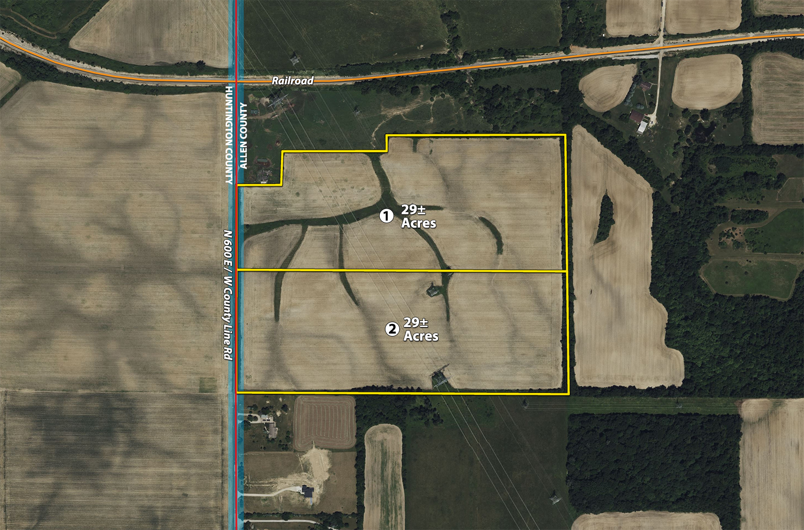 Tract 1: 29 ac mostly tillable. Soils are Blount Silt Loam and Glynwood. Frontage on Allen/Huntington County Line Road.