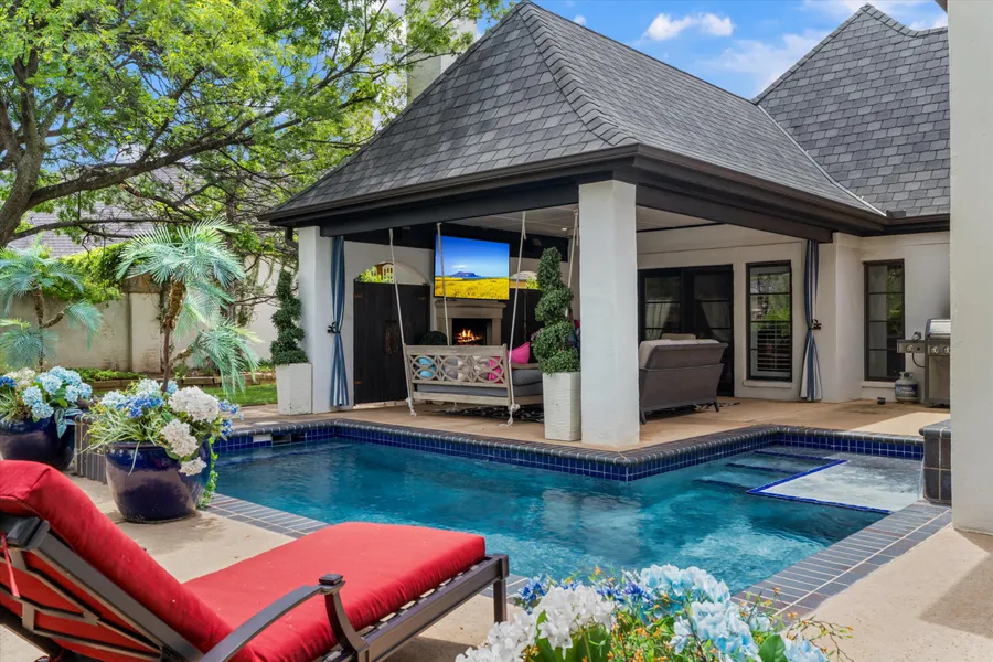 Elegance and sophistication abound in this custom built masterpiece, a meticulously crafted residence exuding unparalleled quality from every corner. Step into the grand formal dining and living rooms adorned with a stunning limestone fireplace, setting the stage for large-scale entertaining in the heart of this exclusive abode. Experience the epitome of culinary artistry in the open-concept kitchen, where imported stone countertops, a large island, dual dishwashers, wine cooler, breakfast bar, and warming drawer harmonize to create a chef's dream space. The family room, complete with a fireplace, seamlessly transitions to the enchanting patio and pool area, offering a seamless blend of indoor-outdoor living at its finest. Every detail speaks of opulence and refinement, from the surround-sound system on the lower level to the intricate crown molding and the solid core doors throughout. The Primary Bedroom is a true retreat, featuring a separate sitting room overlooking the pool, a breathtaking limestone fireplace with an antique carved mantle, and spacious primary bathroom. Ascend the custom iron and brass railed stairs to discover two generously sized ensuite bedrooms, each boasting full baths and walk-in closets. Additionally, a versatile multi-purpose room awaits. Outdoors, the inviting patio beckons with a fireplace and a sparkling pool, creating a serene retreat for relaxation and entertainment. Nestled on a peaceful cul-de-sac, this home offers an abundance of built-ins for storage and organization, all seamlessly capturing the timeless elegance of Jack Arnold design. This is truly a Gaillardia residence you won’t want to miss. Schedule your private tour today!