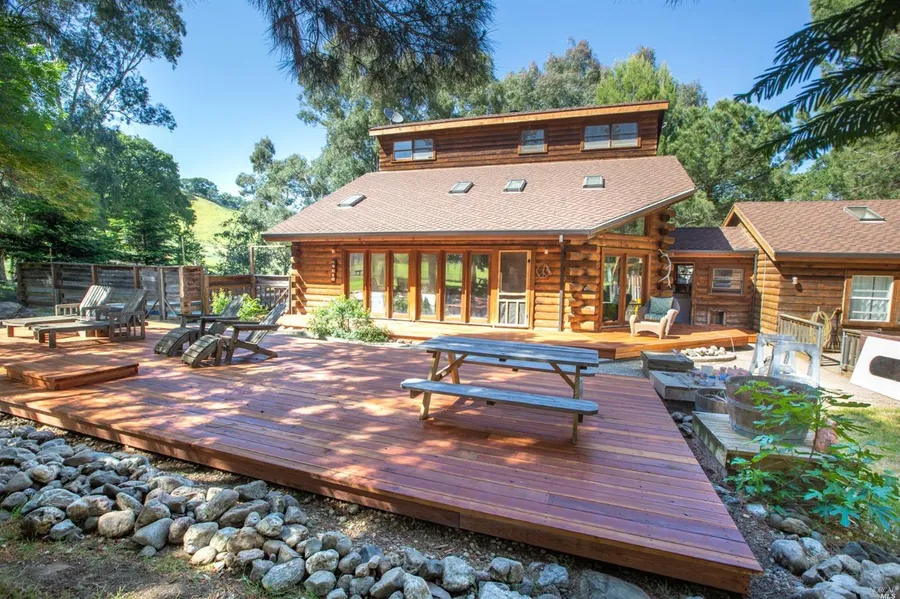 Your own private haven awaits...amazing views surround this custom log home on 59.5 acres w/seasonal creek, 10 stall barn + addl barns. Perfect for horse/dog/animal enthusiasts, private animal rescue. Secluded but close to fwy. Open, bright floor plan w/soaring ceilings,new interior paint. Terra cotta tile on main level, wood burning stove. MBD w/retreat area on main level. In-ground pool,new redwood decking & guest units perfect for entertaining