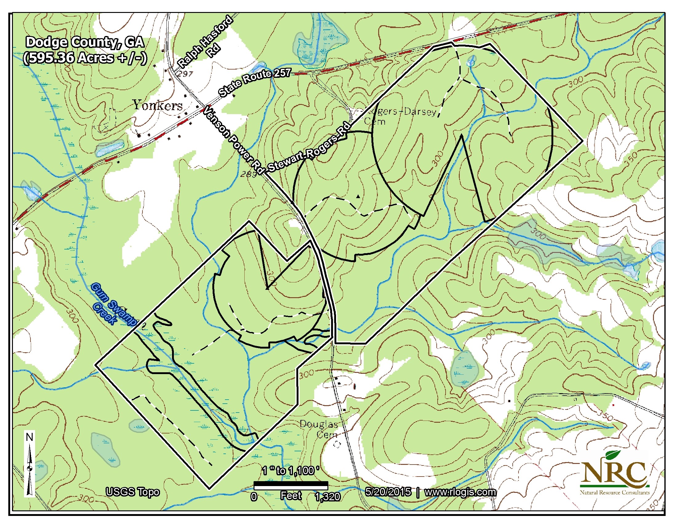 Gum Creek is 595 acres of irrigated farmland and timberland located in Dodge County, Georgia in an established farming area with good soils and access to markets. Gum Creek is situated close to the crossroads of Yonkers, GA near the town of Cochran. The property has 280 acres of irrigated cropland, with newly installed well and irrigation equipment. It also has over 100 acres of hardwood on the headwaters of the Ocmulgee River with food plots and approximately 200 acres of newly planted pine.