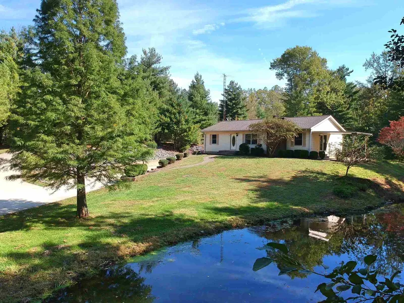 Calling all outdoorsy people! WATER, ACREAGE, POLE BARN... And cheap utilities too! The seller had 24 solar panels ($20,000) installed on the pole building that feed into the one electric meter for the house and building. Not to mention two new concrete driveways poured all the way from the road to the house and to the barn- what a beautiful tree-lined entrance to this 6 acre property! Two private lakes filled with albino catfish, blue gill, gold fish, bass, turtles, and even an otter has come to visit! Excavated trails in place, scenic land with fruit bearing trees peach, pear, apple, plum, nectarine, cherry, pecan & walnut. Superb and clean barn with a concrete floor, heat source, and lighting. Large carport / shelter attached on the back of the barn. The house features an open floor plan, large bedrooms, main level laundry, covered porch off of the dining room and a SUNROOM with a half bath. Electric insert in the fireplace (gas capped off). Roomy kitchen with updated SS appliances. The hallway bath has dual sinks, bathtub and separate shower. The full basement houses the 2 car garage and provides plenty of storage space. Spectrum internet available per seller. Seller is providing a $535 AHS HW at closing.