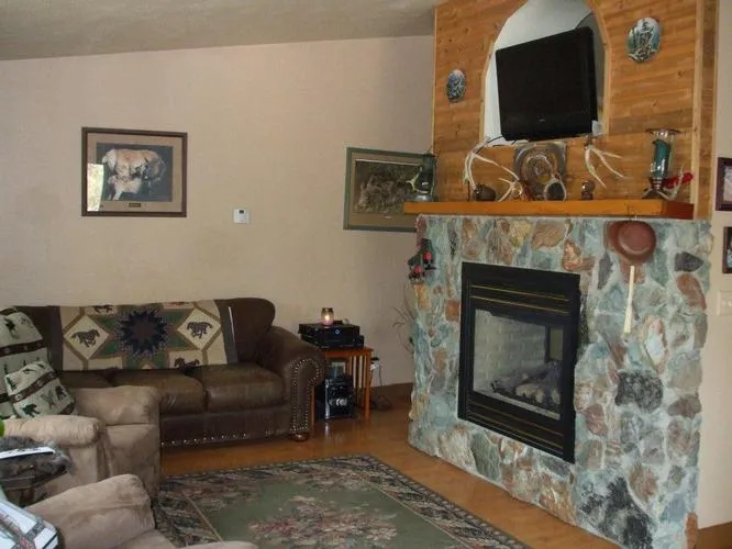 There is alot of home here for the money. Must see inside. Four bedrooms, 3 baths. Living room, family room, den. Full daylight basement. Home boast wood floors, large kitchen and dining area, open floor plan. There is a see through gas fireplace in living/dining area. All of this sits on 6 private treed acres.Convenient location with easy access