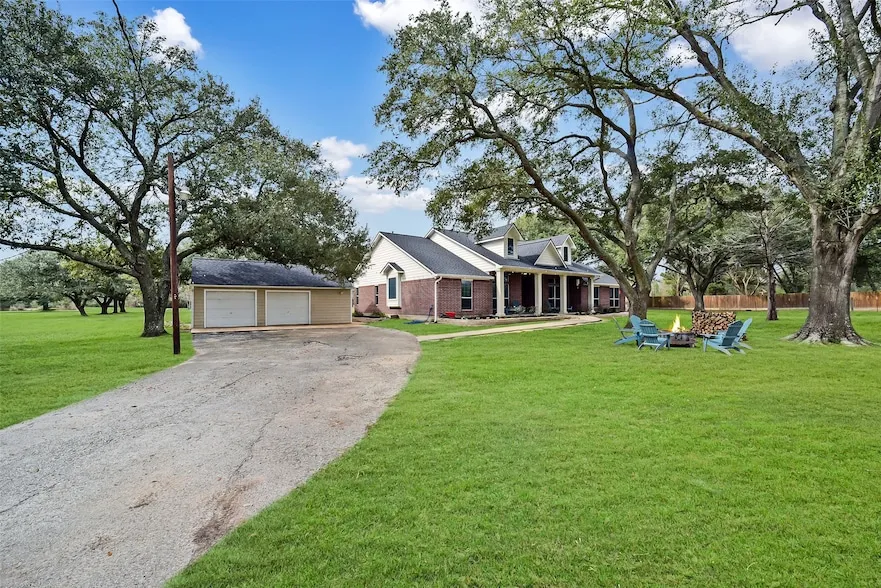 Acreage, Horses, Cows, Chickens, Goats, Grand-children are all welcome! Amazing Country living, close to the city. Super quiet, beautiful trees with plenty of space for horses, chickens and goats! You will love living in this dreamy one story home, surrounded by pecan shade trees. Plenty of parking, easy to bring your horse trailer to the barn or back pasture. Home features a large inviting front porch and back porch with a recently added sunroom, generator, 2024 roof, both water heaters replaced July 2025, pond, barnmaster 3 stall with tack and wash, fenced pasture, fenced side yard with outdoor shower, oversized garage with room for a workshop, pole barn and more. Lots of space to add another home or business or barn. Plenty of space to add a pool. Home is well and septic, with propane. If you are wanting a change of space, tired of living on top of your neighbors, dreaming of the farm...