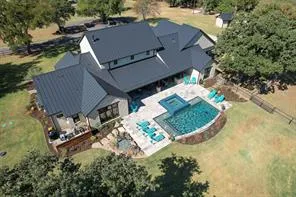Arguably the most breathtaking view in Denton County! No expense was spared on this spectacular property. The entire 6+ acre property is fenced in with 4 ft pipe fencing, has a 0.75-acre pond stocked in 2019 with largemouth bass with aeration pump and custom dock, 850 ft deep water well with pump for irrigation and stone wellhouse, huge covered and paved shed, and so much more! Walking through the front door, you are greeted by warm hardwood floors, a wall of windows with the most beautiful views, and vaulted ceilings with solid cedar beams in the spacious open great room. Kitchen boasts a huge center island, commercial grade gas range and vent, built-in refrigerator, and ample storage. Head out back to the backyard oasis with negative edge spa, pool with chiller and in-floor cleaning system or go down to the pond and fish for large-mouth bass or sit around the firepit.