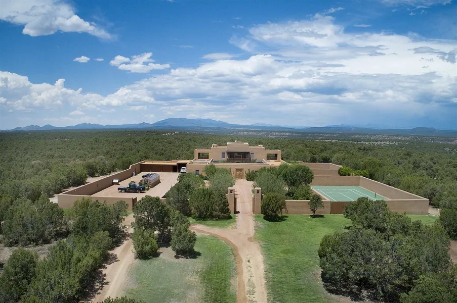 Galisteo Ranch. A rare opportunity to own this one of a kind, 6,173 acre ranch and extravagant hacienda. Strategically placed among 3,385 deeded acres and 2,278 leased acres of State of New Mexico ranch land south of Santa Fe, is the 13,223 square foot, 8 bedroom, 8.5 bath Pueblo Revival Style adobe hacienda and 3,000+ square foot, 2 bedroom, 2 bath guest home. The main hacienda compound wraps around a Spanish colonial, portal lined and landscaped courtyard and welcomes you into this unique home, abundant with vigas and beams, wood and Saltillo tile floors, kivas, decorative lighting, and numerous built-in bookcases and cabinets. The main floor alone has a modern chefs kitchen complete with an AGA cast-iron range, dining room, den, 2 offices/studies, and 7 bedrooms, including the master suite with its own dressing area. The upstairs is for relaxation, with its spacious great room, library, media room, plus an additional bedroom. The basement has 2 game rooms and abundant storage. The 3,000+ square foot guest home is the perfect addition when hosting large scale reunions and entertaining. Special features of this property include a tennis court, swimming pool, multiple portals and decks, and a 3-car garage. Wide open vistas and mountain views. A very private setting yet only 30 minutes from all of the cultural, culinary, and recreational amenities of Santa Fe.