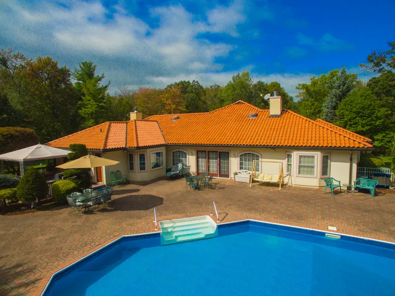 Mediterranean beauty in rural Orange County NY emphasizes the classic museum quality finishes of this newer Tuscan Villa style home. The construction of this red terracotta tile roof and stucco exterior home spared no expense with overhanging eaves and extensive gutters to remove drainage from the sides of this single level residence. Especially tasteful are the extensive arboretum style professionally landscaped gardens with decorative trees and bushes around the extensively groomed and irrigated lawn and yard. Custom cut stonework is featured throughout the interior. As a dream home made for entertaining the focus of the great central hall is a single piece hand carved black onyx granite fireplace mantle at the side of the grand salon. All interior floors are tiled with cut marble and even the window sills are either marble or granite stone. The four private bedrooms with walk-in closets are at the corners of the home allowing substantial natural lighting with windows on two walls. Spacious interior rooms have wonderful lighting to emphasize the gracious designs of the ornate interior finishes which include marbleized hand painted decorative columns and door trim. The several exterior doors open out to the stone paved patio and lush landscaped gardens. Inside enjoy the comfort of spacious well appointed (even opulent) rooms and the conveniences of a fully equipped black granite counter gourmet kitchen. The entry driveway is a boulevard from the main road lined with groomed trees and the approach to the house is through a dense private forest - up to the entry gate. Then the grand entrance bursts open to the luxuriously landscaped grounds around the house which are extensively groomed with exotic bushes and specimen trees trimmed to natural sculptured forms. In the large side yard is a monumental stone lined waterfall feeding a koi pond with screened gazebo next to it with a lit bocce ball court for evening activities.