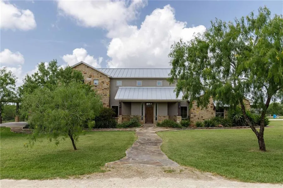 COUNTRY SOPHISTICATION DESCRIBES THIS STUNNING STONE & STUCCO HOME SITUATED ON 6.25 +/- ACRES ADORNED WITH MESQUITE TREES! A sanctuary away from "city life" you'll fall in love with this thoughtfully designed, custom built home w/wonderful open floor plan. Living room & dining area have soaring cathedral ceilings featuring jaw dropping wood beams w/turnbuckle trusses and stunning floor to ceiling rock fireplace. Beautiful kitchen has oversized island, farmhouse style sink, gas stove & amazing refrigerator. Tranquil master bedroom w/amazing windows has en suite bath w/walk in shower, garden tub w/chandelier accent, double sinks & dream closet. Secondary bedrooms all great sized w/large closets. Upstairs room w/private bath is a wonderful place for guests. Spacious mud room. Plantation shutters & laminate plank floors throughout. Spend time with family & friends enjoying the sunsets on the amazing patio w/outdoor fireplace overlooking huge pond & 30x80 +/- barn. SUCH A SPECIAL HOME! For more information call Lisa Hunt 361.726.8131