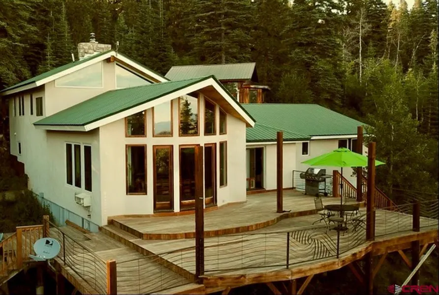 The owner built this home to encompass great function, amazing views, and preserved privacy. Entering through the front door you are greeted by a large loft area handsomely covered with reclaimed oak flooring. The staircase wraps around the central fireplace leading down onto the main floor. In the expansive living area you are greeted by the Colorado landscape through a set of oversized windows and a full glass door, creating harmony with the interior of the home. The post and beam structure, with locally harvested straw bale infill capitalizes on the passive solar throughout the house making for highly efficient warmth in the winter and cool temperatures in the summer months with affordable comfort. There are two bedrooms in separate areas of the main level, one having it's own private bath featuring a slate tiled double shower. The second bedroom is at the end of a hallway and features views out into the aspen meadow. The open, large kitchen is perfect for entertaining with plenty of storage and reclaimed maple cabinetry. The detached, oversized two car garage has plenty of room for extra storage, and also features an adjacent shop space. The home sits on two lots making for quiet enjoyment inside and out. This is the perfect space to get away from the hustle and bustle of downtown Durango, while still being less than 15 minutes to town. National Forest access with hiking, biking, climbing, and hunting are footsteps out the door. Arguably the showcase of the house is a 2 level Brazilian hardwood deck of over 1000 square feet with custom steel railings and expansive views as far as the mountains beyond Pagosa Springs. The property also has a hot tub pad ready to go with 220 power. Durango offers so much including raft/kayak and gold medal fishing on the Animas River, Fort Lewis College. In town walking/bike path, excellent restaurants, shops, Mesa Verde national park and great skiing. The Narrow Gauge Railroad is amazing with trains through most of the season. The owner has taken great pride in the home and is ready for the new owner to enjoy the property as he has.