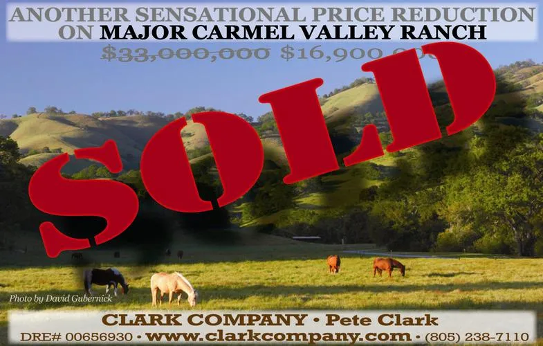 Just 27 miles east of Pebble Beach, this 6,375±-acre cattle ranch offers a true ranching environment a short distance from the charming communities of Carmel Valley Village and Carmel-by-the-Sea. Extensive improvements include main residence, guest home, caretaker's house and barn. A pervasive road system makes all areas of the ranch accessible by vehicle. There is good water with 12 developed springs and 21 stock ponds as well as excellent wildlife populations including: deer, turkey, quail, bobcat and Russian wild boar. A 30-minute drive to the Monterey Peninsula Airport, this property has the potential to grow grapes.